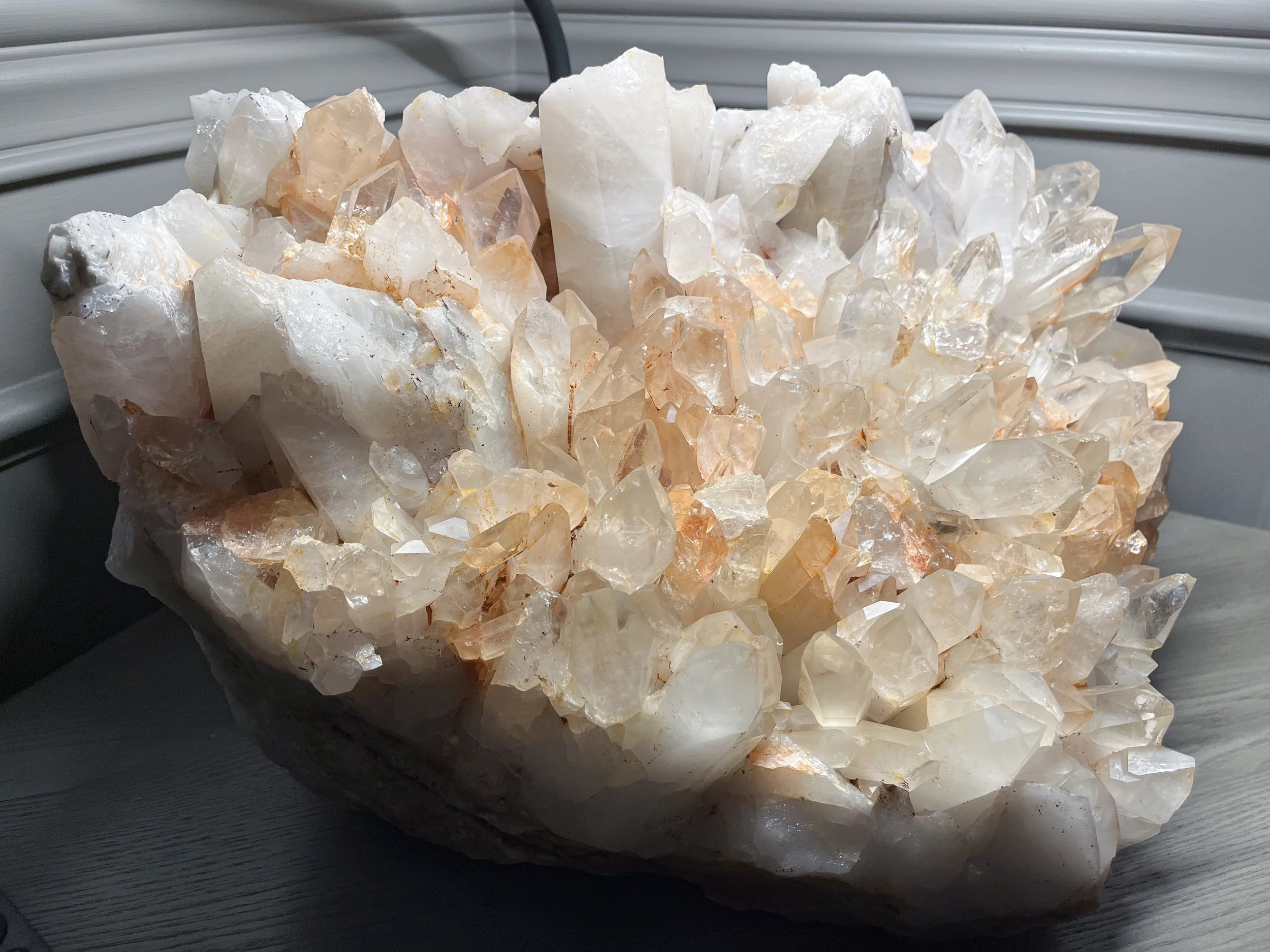 The very best examples of natural Rock Quartz will exhibit unique and varying coloration patterns in hues that range from ruddy rust to various subdued shades of light orange or yellows, along with the rarer clear/transparent or faintly “milky” patterned spires. Occasionally, dark inclusions that may resemble fine lace or fog are found in clear examples – coining the term “shadow” quartz.